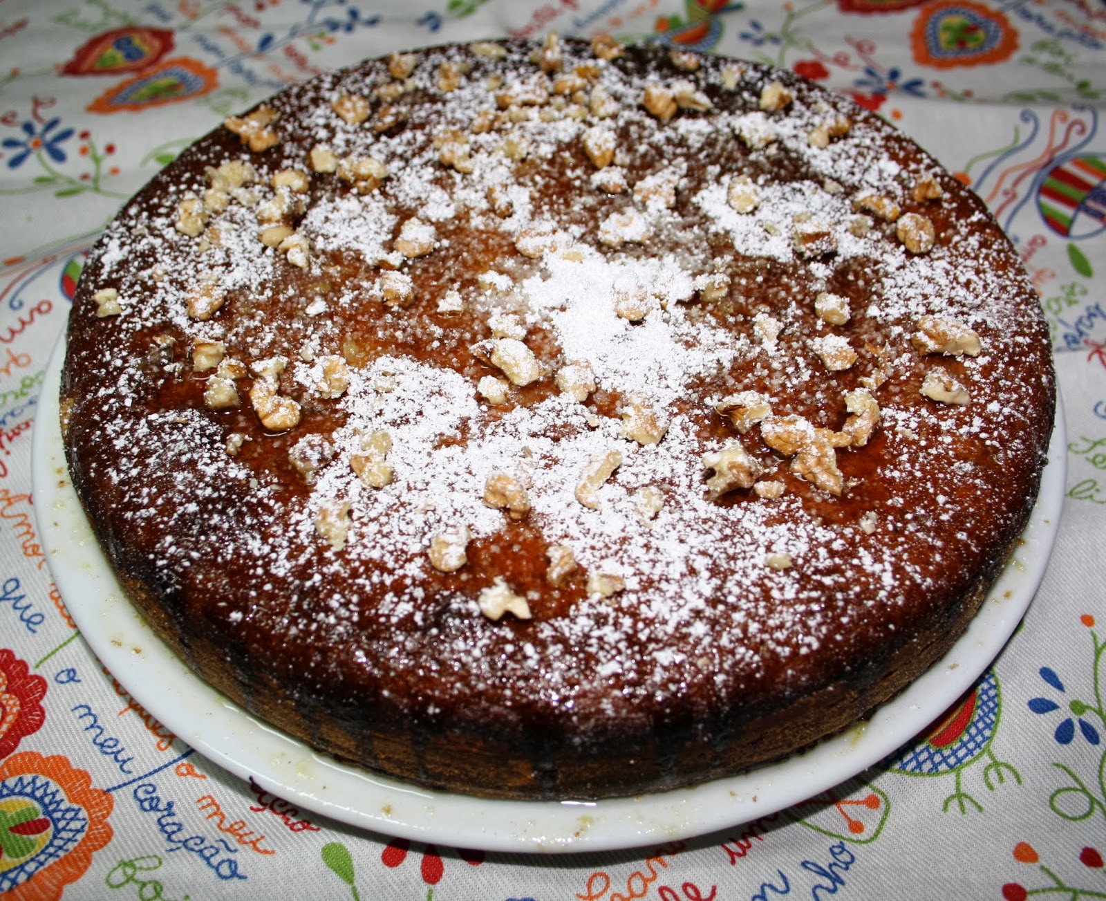 Quando o bolo estiver cozido (teste com um palito), desenforme e regue com a calda. Deixe arrefecer totalmente e decore a gosto (por exemplo com nozes e açúcar em pó).