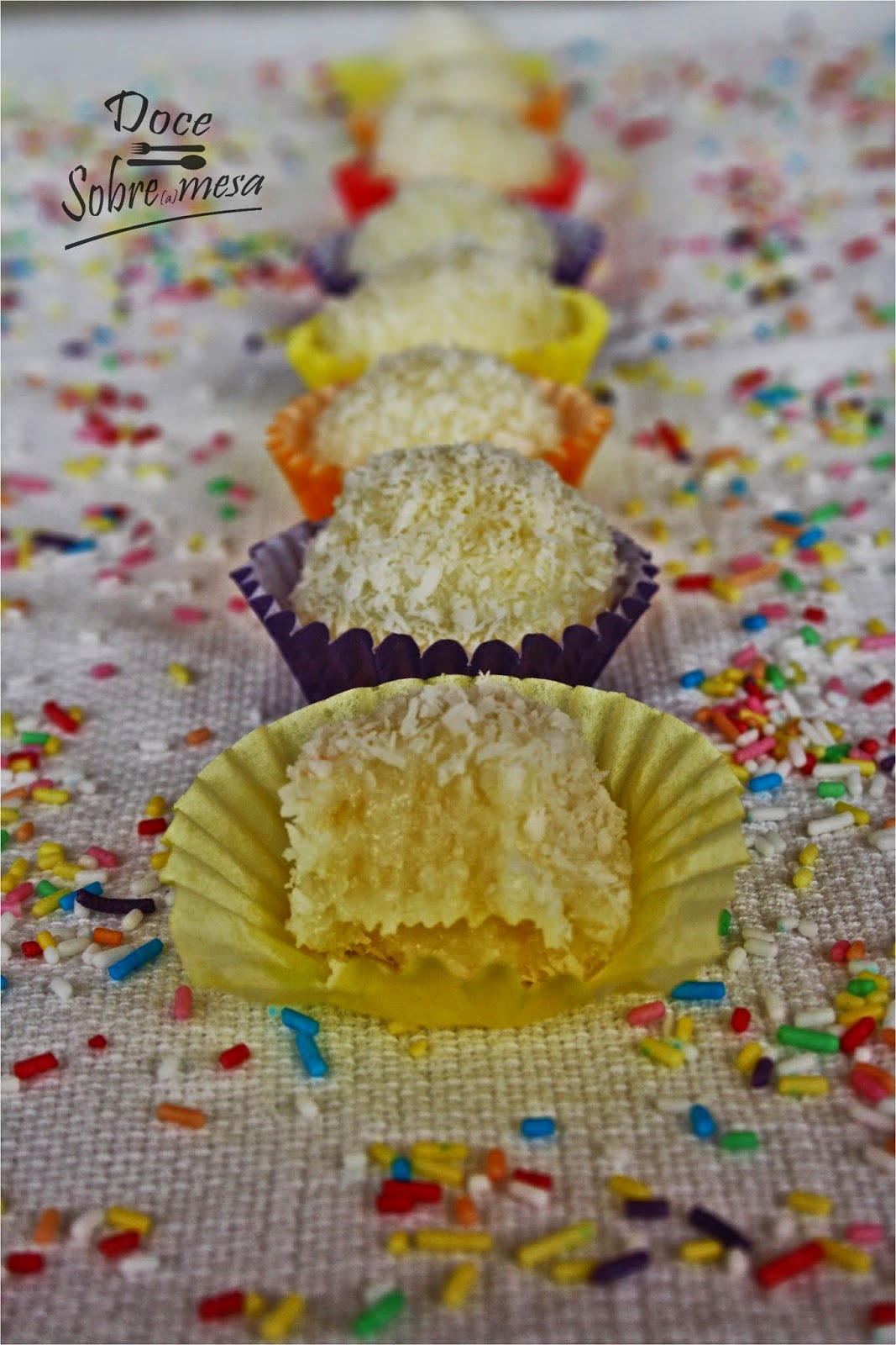- Com a ajuda de uma colher (de chá) retire porções de massa e, com as mãos, molde bolinhas. Passe-as por côco ralado e coloque em formas de papel. (Para ajudar a moldar as bolinhas, basta ter as mãos húmidas. Pode também untar as mãos com manteiga, eu prefiro não usar mais gordura, passo as mãos por água e já está!)