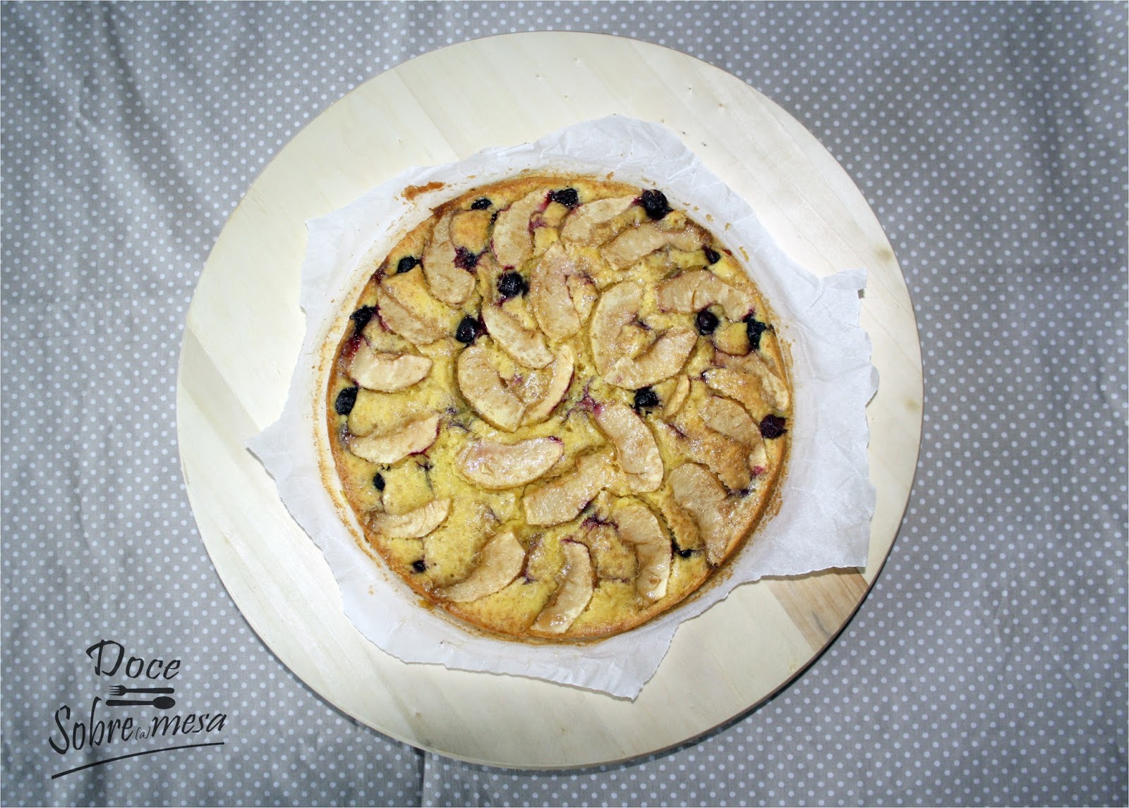 - Coloque a massa na forma e, por cima, coloque a maçã e os mirtilos dispostos da forma que desejar. Polvilhe com o açúcar mascavado eleve ao forno por, aproximadamente, 45 minutos.