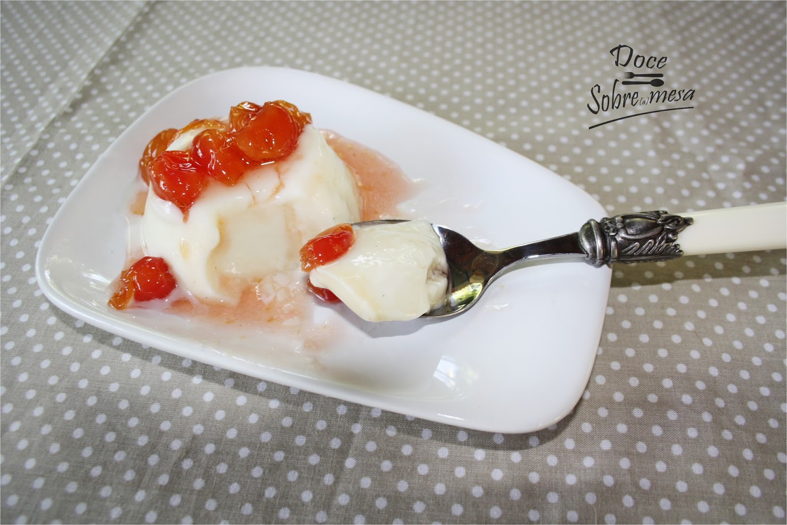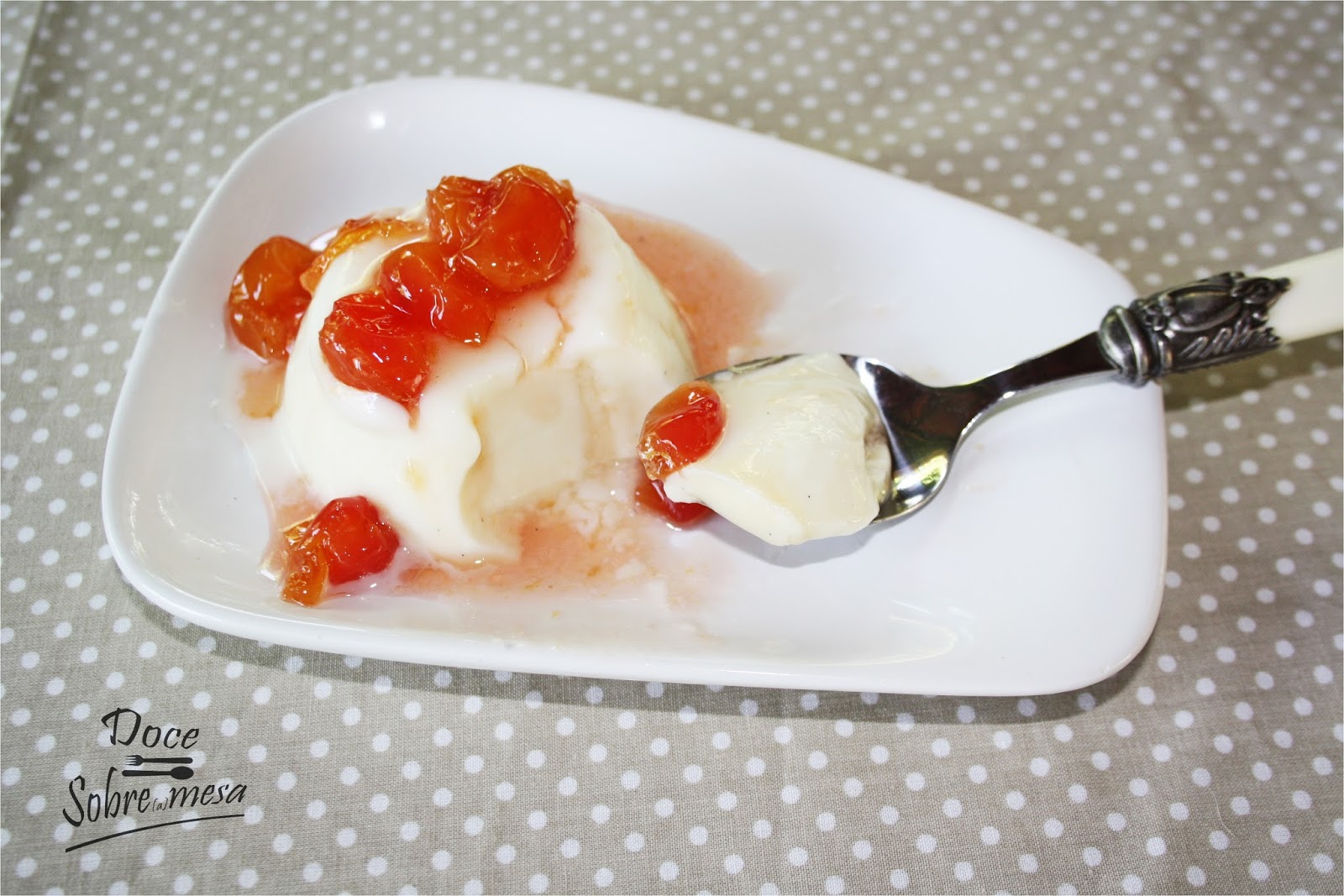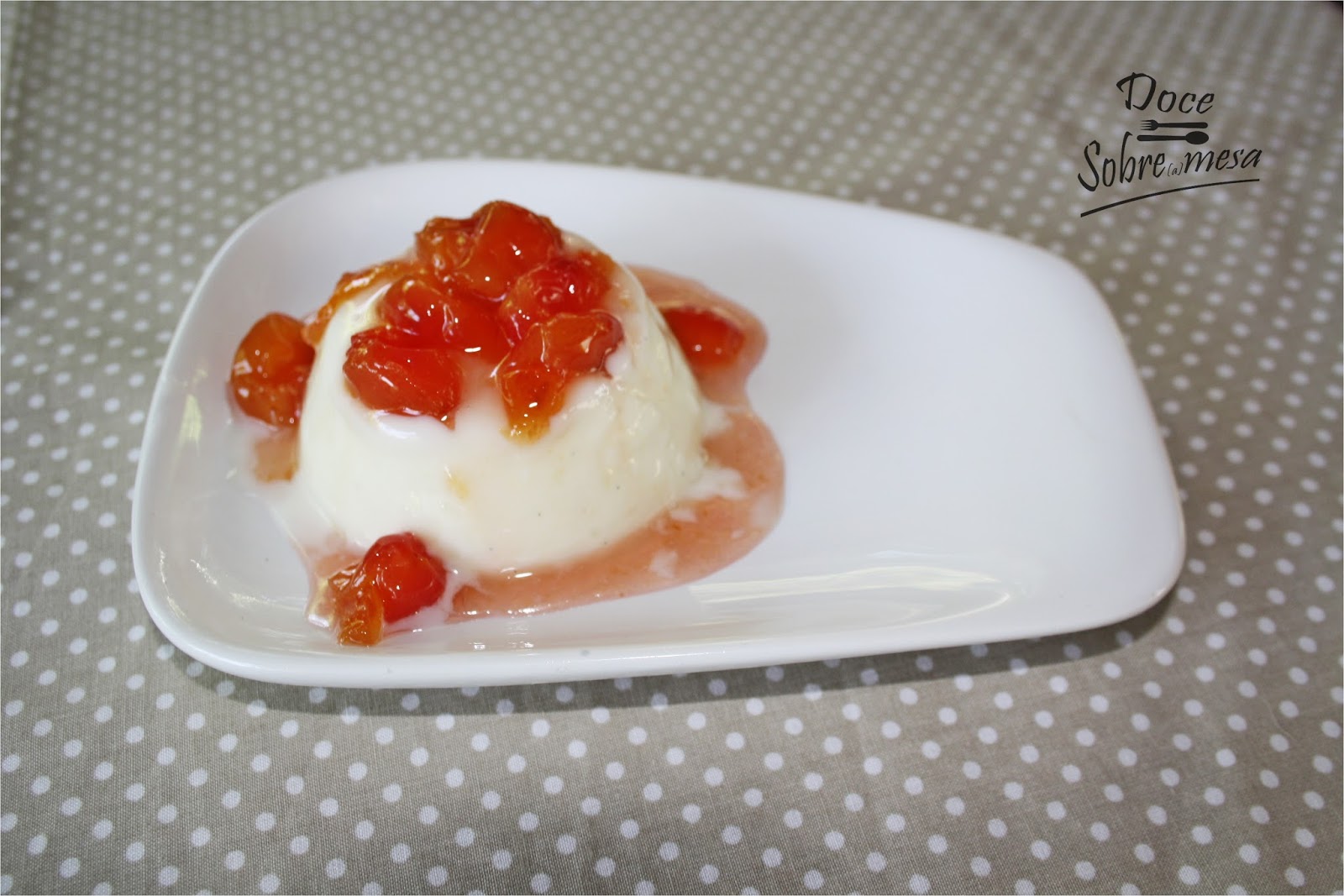 - Na hora de servir, desenforme as panacotas e coloque por cima o doce de cereja.
